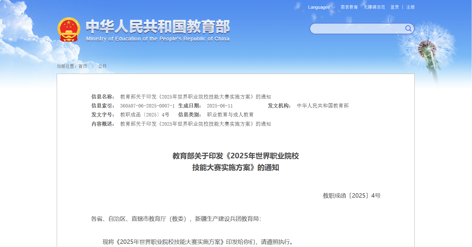 為貫徹落實《教育強國建設(shè)規(guī)劃綱要(2024—2035年)》,進(jìn)一步提升世界職業(yè)院校技能大賽(以下簡稱大賽)內(nèi)涵質(zhì)量,發(fā)揮大賽對高技能人才培養(yǎng)的引領(lǐng)作用,擴(kuò)大我國職業(yè)教育國際影響力,經(jīng)大賽組織委員會(以下簡稱大賽組委會)研究決定,舉辦2025年世界職業(yè)院校技能大賽。
