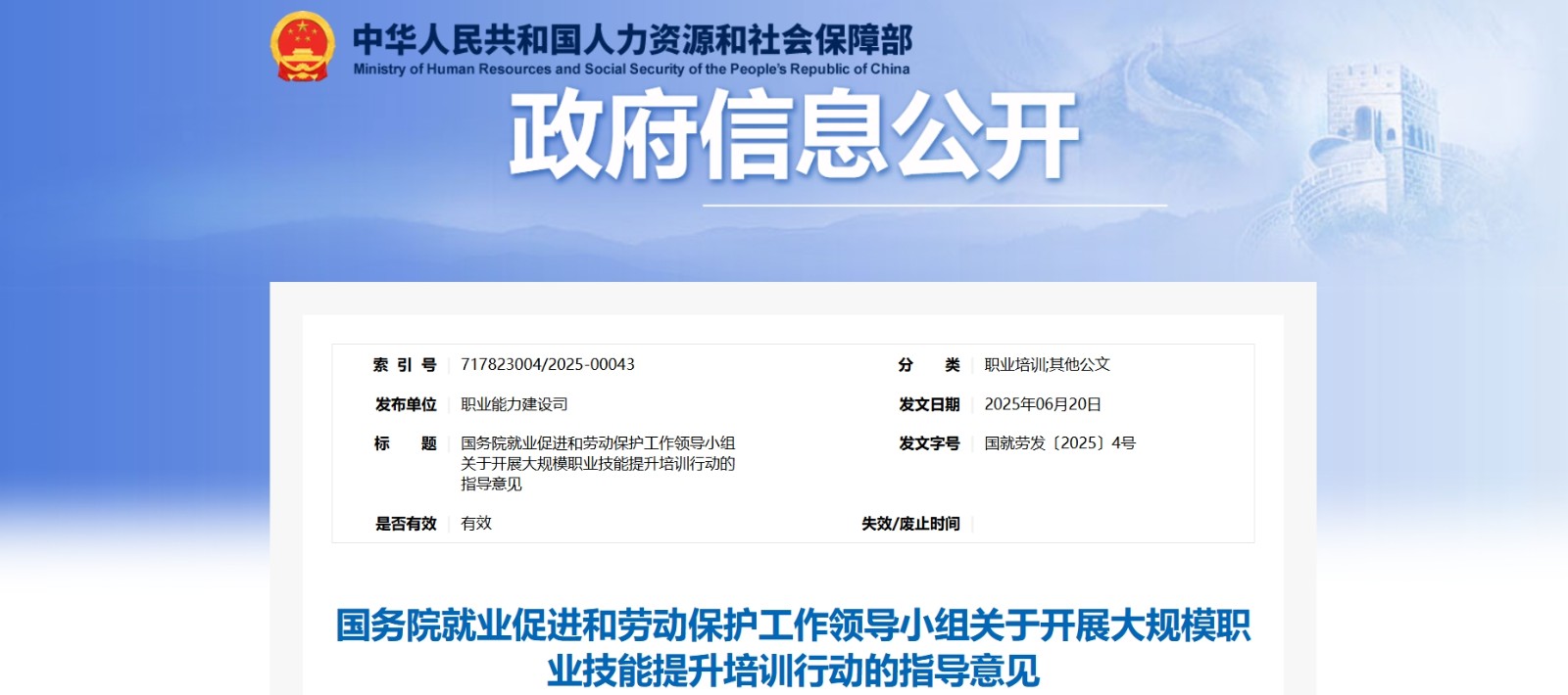 為應(yīng)對(duì)挑戰(zhàn)、擴(kuò)大內(nèi)需、促進(jìn)高質(zhì)量就業(yè)、助力勞動(dòng)者提技增收,國務(wù)院就業(yè)促進(jìn)和勞動(dòng)保護(hù)工作領(lǐng)導(dǎo)小組正式印發(fā)《關(guān)于開展大規(guī)模職業(yè)技能提升培訓(xùn)行動(dòng)的指導(dǎo)意見》(國就勞發(fā)〔2025〕4號(hào))。