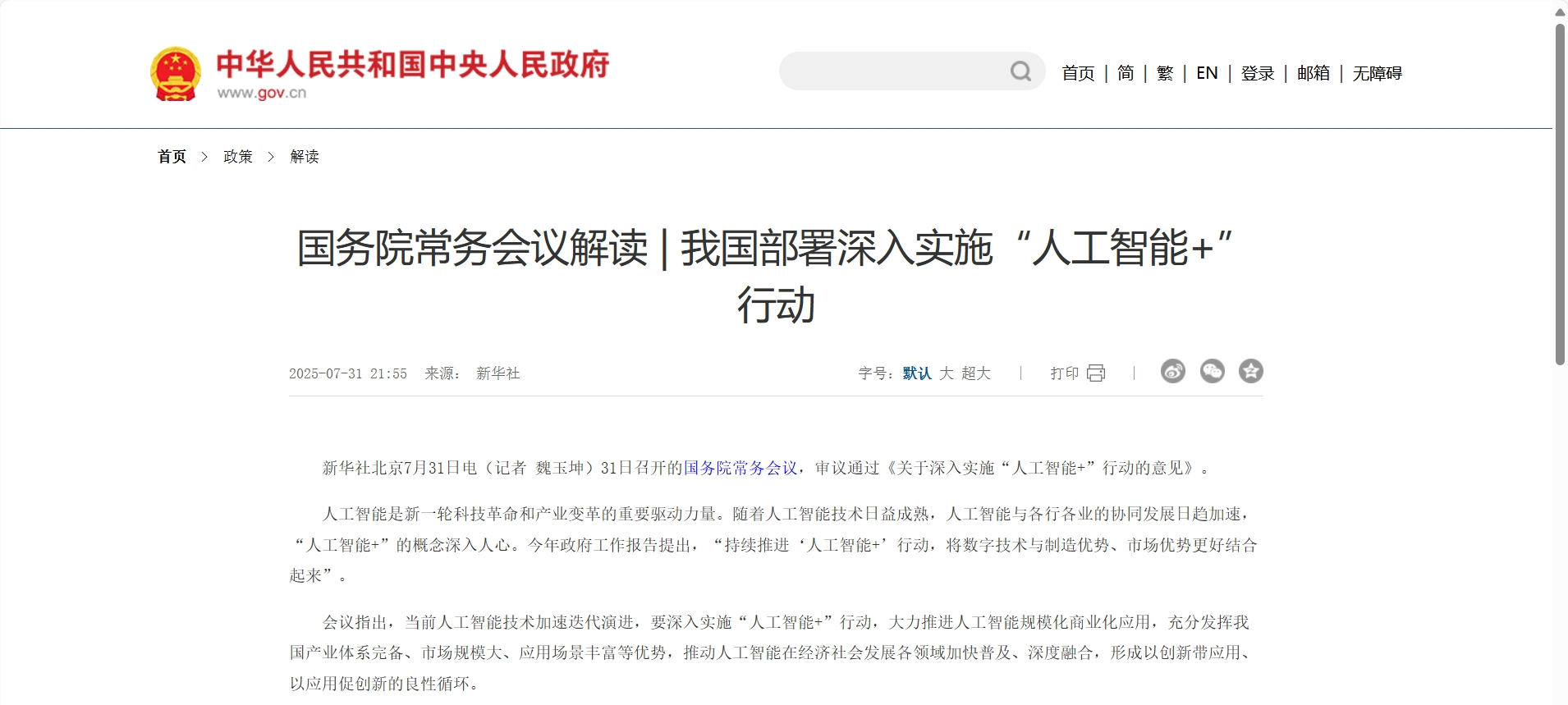 國(guó)家戰(zhàn)略高度: 國(guó)務(wù)院常務(wù)會(huì)議審議通過(guò),標(biāo)志著“人工智能+”行動(dòng)成為國(guó)家層面的重要戰(zhàn)略部署。